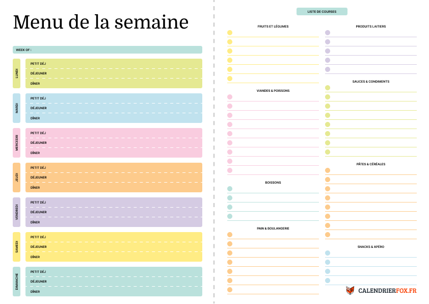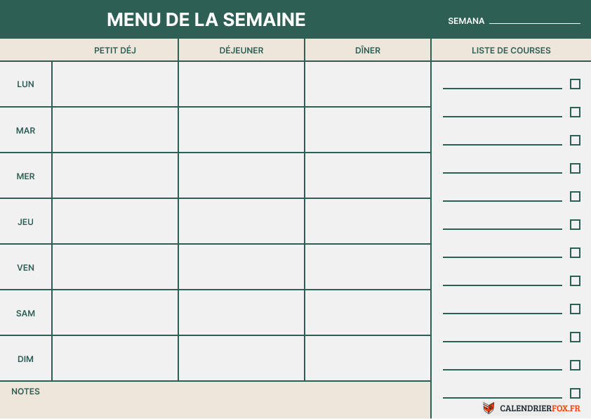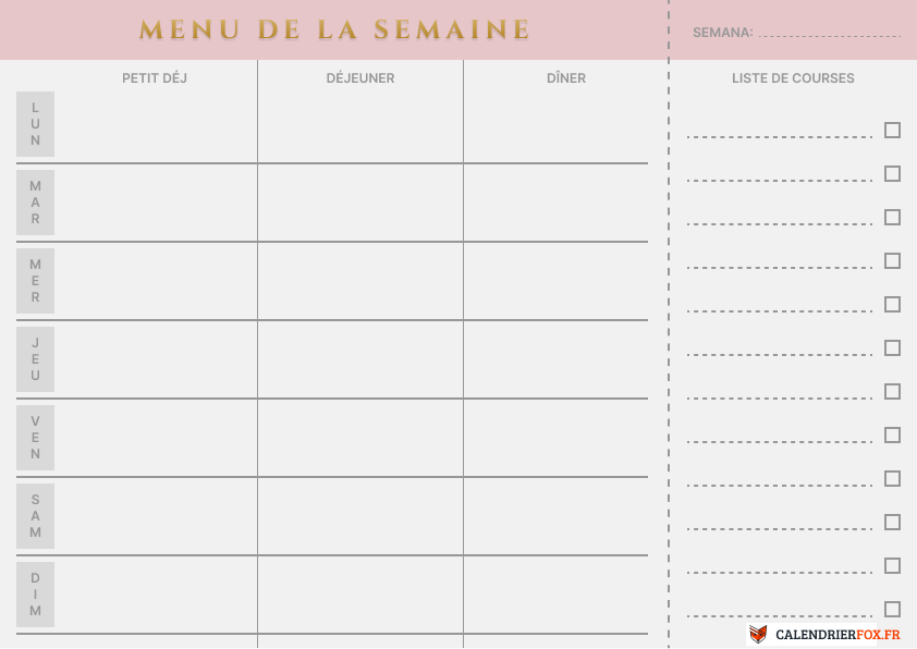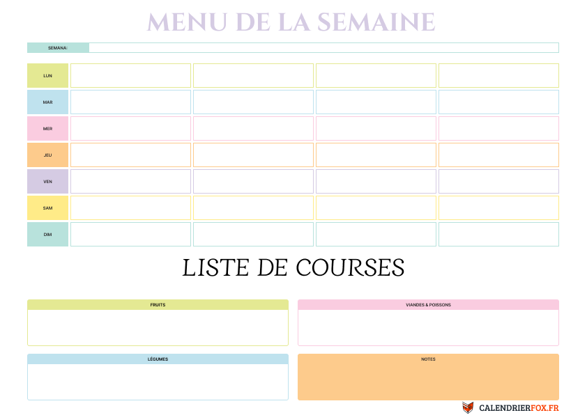 Planifiez vos repas facilement avec notre “Menu de la semaine” imprimable. Notez vos idées repas jour par jour et ajoutez votre liste de courses pour gagner du temps, réduire le stress et cuisiner plus sereinement toute la semaine.