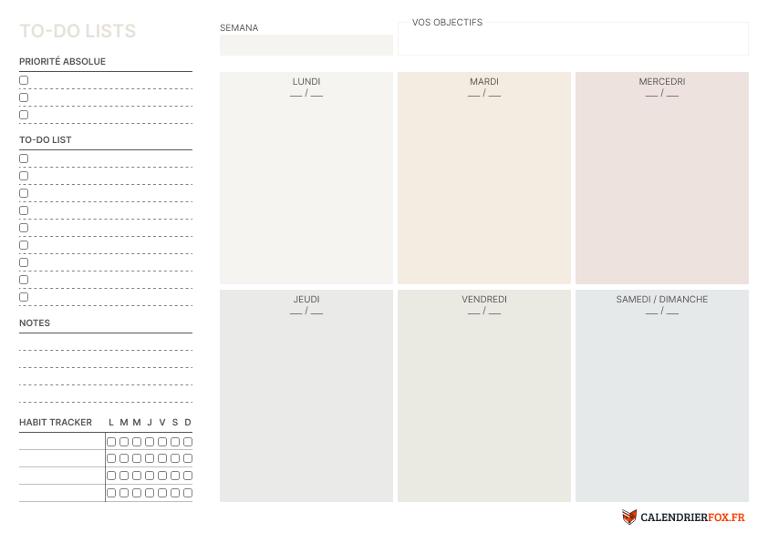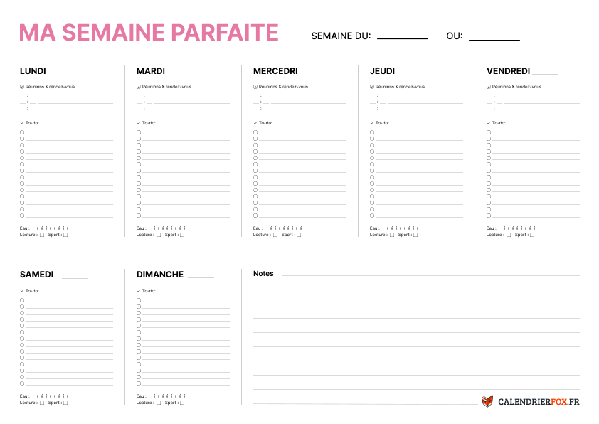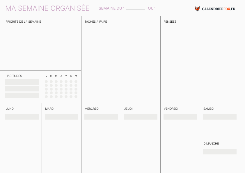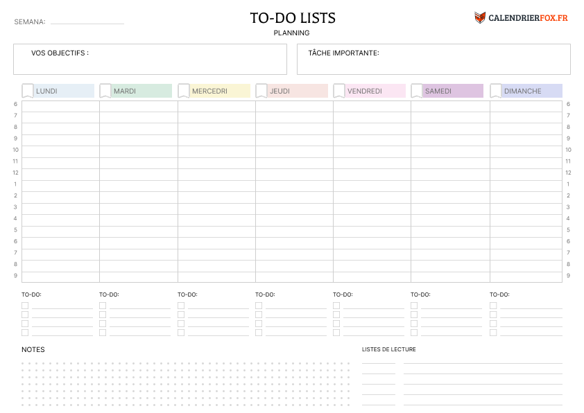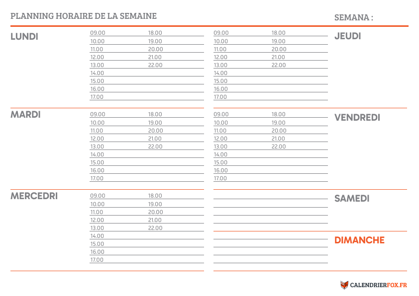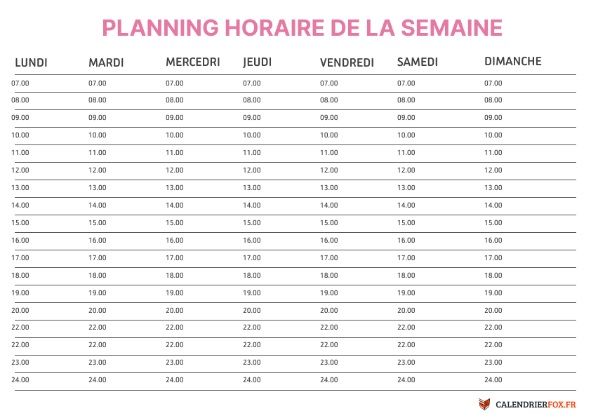 Organisez vos journées heure par heure avec notre planning hebdomadaire. Nous avons créé des modèles commençant à 6h, 7h ou 9h du matin. Choisissez celui qui correspond le mieux à votre rythme quotidien.