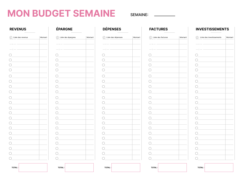 Gérez facilement vos finances avec notre modèle de budget hebdomadaire. Suivez vos revenus, votre épargne, vos dépenses, vos factures et vos investissements au même endroit. Téléchargez gratuitement le PDF A4 et organisez votre argent semaine après semaine.