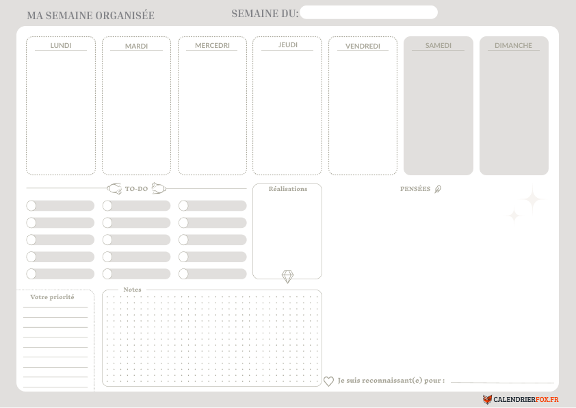 Ce semainier est idéal pour les étudiants, professeurs, freelances, etc. Vous pouvez y noter vos idées, rappels, moments importants ou citations inspirantes. Téléchargez et imprimez-le dès aujourd’hui en PDF, format A4 et orientation paysage.