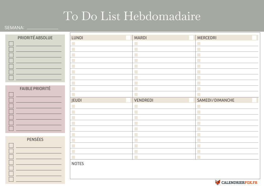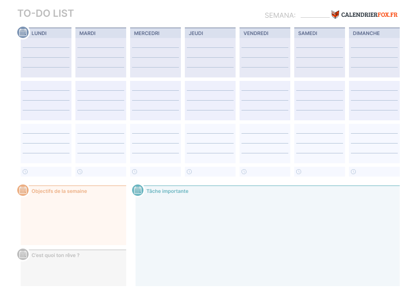 Organisez vos tâches de la semaine avec notre semainier liste de tâches. Ce modèle vous permet de noter vos to-do, priorités et rappels pour chaque jour, afin de rester concentré et productif toute la semaine.