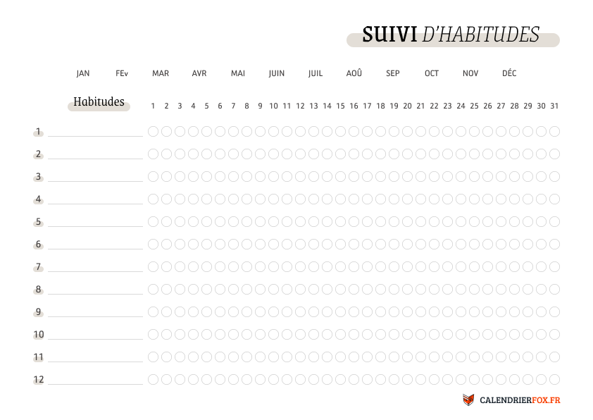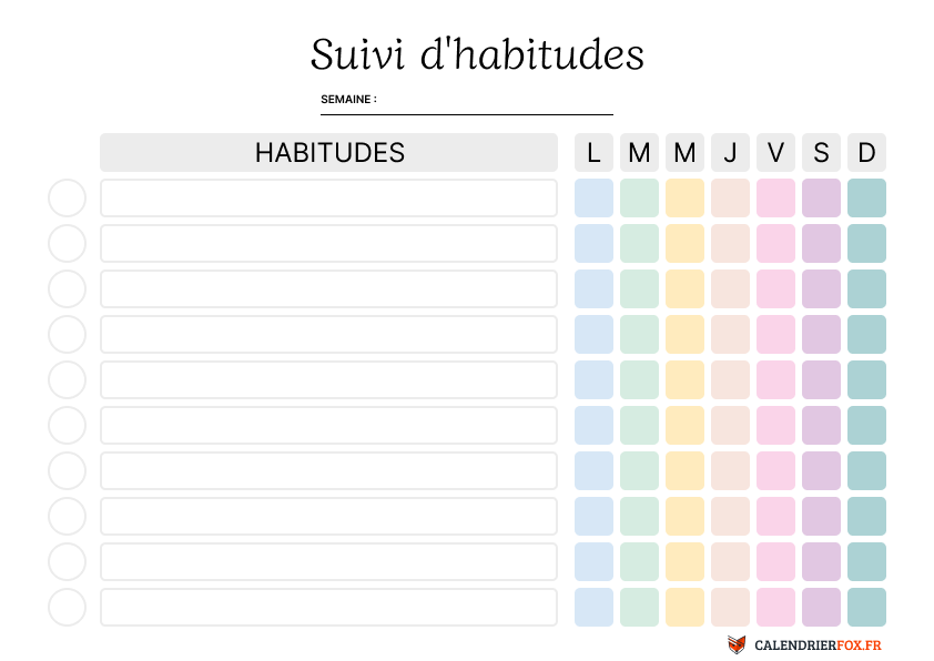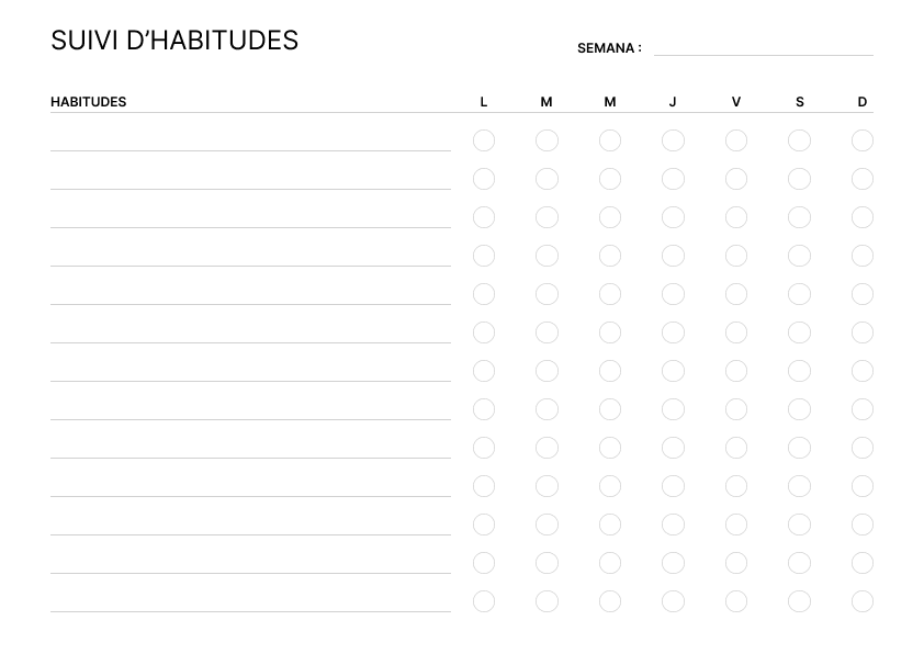 Améliorez votre routine avec notre semainier de suivi d’habitudes. Ce modèle vous aide à suivre vos habitudes quotidiennes, à mesurer vos progrès et à rester motivé tout au long de la semaine.